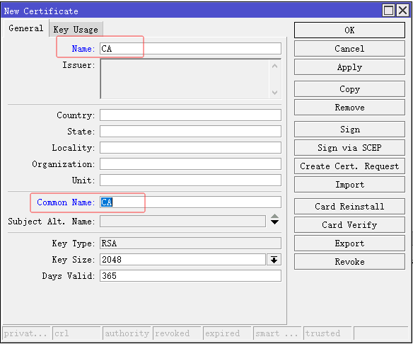签发证书1、配置 OpenVPN 需要创建三张证书,分别是 CA 证书、服务端证书和客户端证书。2、首先创建一张「CA 证书」,选择 System > Certificates > Certificates,创建一张新的证书,在「Name」和「Common Name」两处位置填写证书名称,并在「Key Usage」页面勾选「key cer...